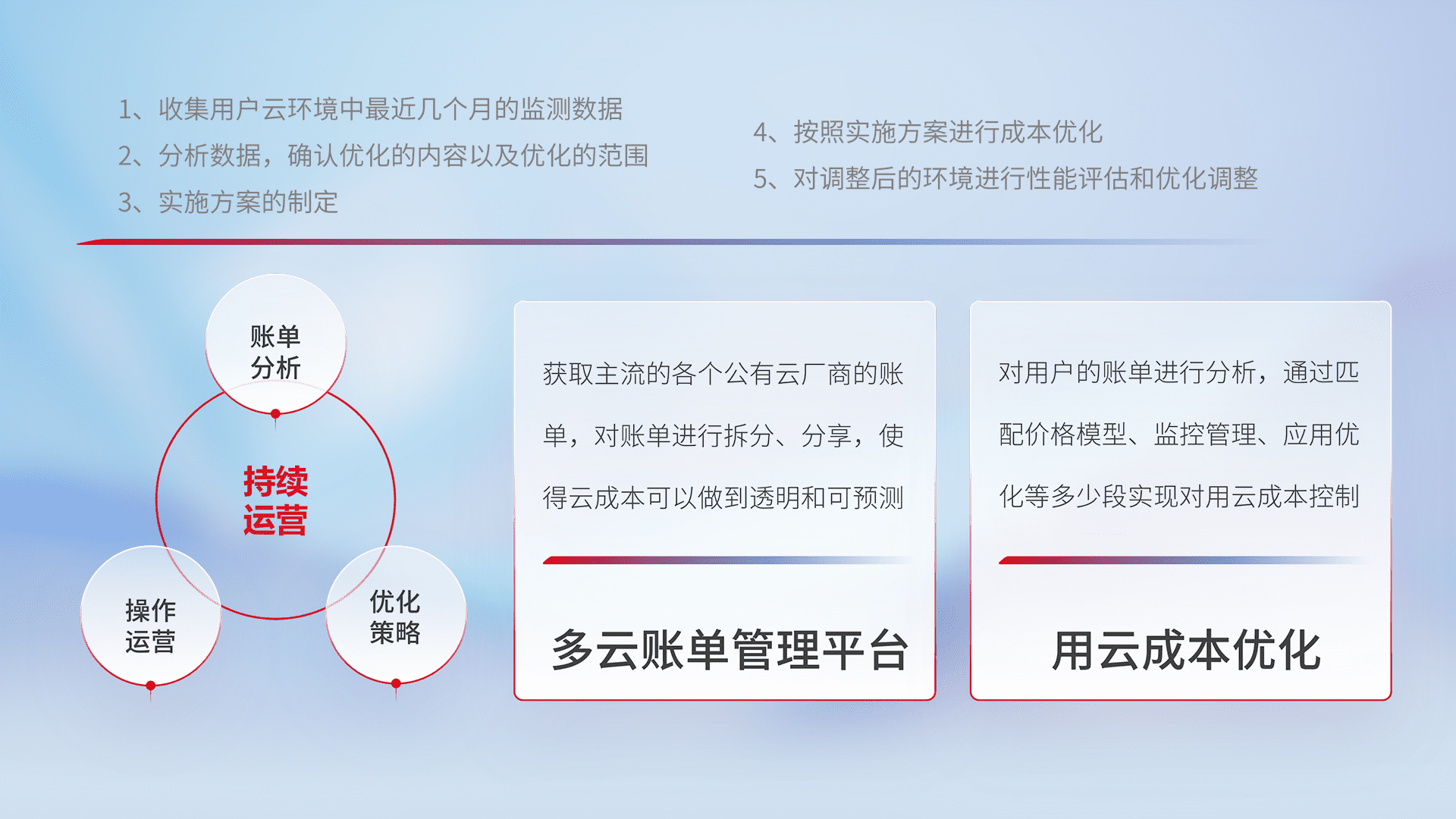 通过多云纳管,,,,以统一的资源数据模型把客户的云资源进行抽象和封装,,进而实现对多云资源的统一操作,,保障云资源管理的可靠性、、稳定性与可用性。。。量身定制化运维内容,,配置、、、、开发运维、、补丁管理、、、、备份、、、监控、、认证和访问管理、、、审计和日常巡检等,,,保障在用云过程中的可靠度,,,,稳定度以及高可用率。。。。