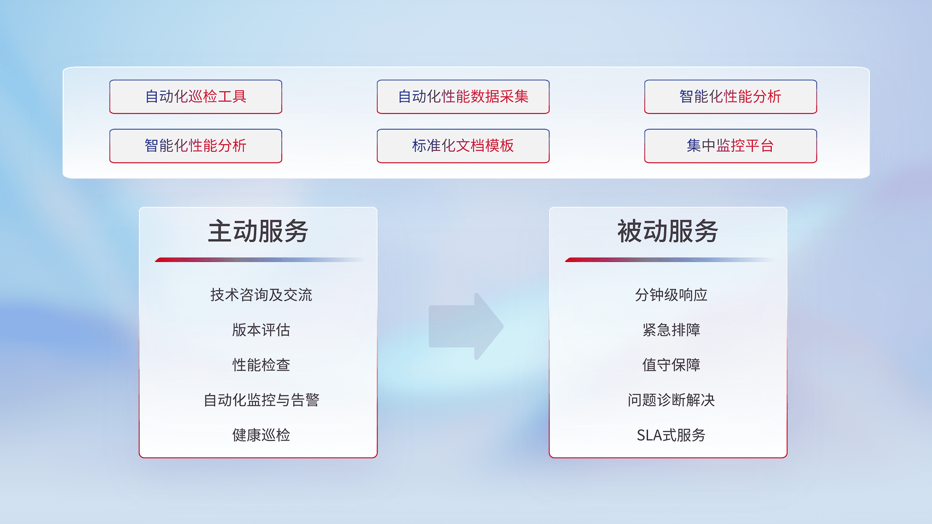 智能化工具和标准化文档,,,保障服务质量,,,提供主动服务(包含技术咨询、、、、版本评估、、、、性能检查、、自动化监控与告警、、健康巡检)和被动服务包含(分钟级响应、、紧急排障、、、值守保障、、、问题诊断解决、、、、SLA服务)。。。