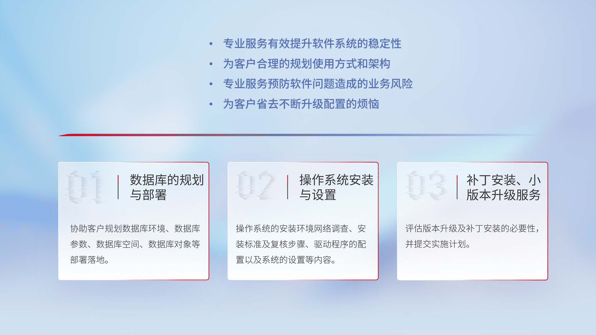 为客户提供软件规模升级、、、快速部署、、、、按需配置的专业服务,,,,从数据库的规划与部署到操作系统的安装与设置,,再到补丁安装和小版本升级提供支持。。。