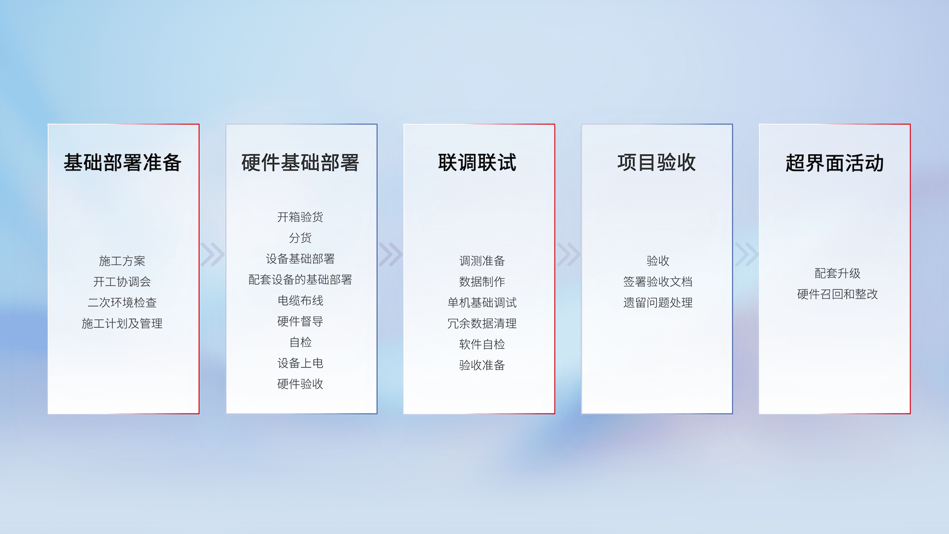 从基础部署准备、、、、硬件基础部署、、、联调联试、、、项目验收、、越界面活动的全过程可追溯,,,保证施工质量和进度。。